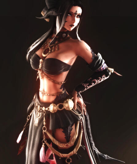 Standing at around 5fulms with a taut, slim figure which pours into a faint hourglass shape. Her build reflect her training over the years, that has led to her muscle tone being defined to push up from underneath her soft, tanned skin. She appears to be free of any markings and blemishes. Hands soft to the touch, almost delicate, which might lead some to believe she hasn't toiled in the fields or done much in the way of actual battle.From looking at Sara, it would be right to assume she is something of a young adult. Having recently come of age. Sara's tresses of silky raven hair flow down long enough to reach down to her mid back. She tyles it with perfection in an abalanian-plait, braiding a section of her hair to use to tie back the rest of her hair in a fluffy ponytail. Her deep-set silvery-blue eyes convey much emotion if she allows it. The dark blue of her eyes are surrounded by glowing rings of silver, making her eyes all the more striking to some.Sara's high cheekbones lead down to rounded, but slim cheeks which befit her youth. The young Xaela's pixie-like nose drops daintily down from its peak. Perhaps more noticeable would be her dark painted, kissable lips which are plush and often glisten invitingly. Upon Sara's soft and feminine face, she wears a little make up at times. For the most part it is a shade of light blue around her almond shaped eyes, to better bring out the dark blue within them. Also the young Xaela often uses a dark shade upon her lips.When it comes to clothing Sara often wears those which are very form fitting if not really revealing. Often showing off her toned thighs and her preference for wearing thigh length boots or stockings. Rarely would anyone catch her in something not fashionable or armour based.